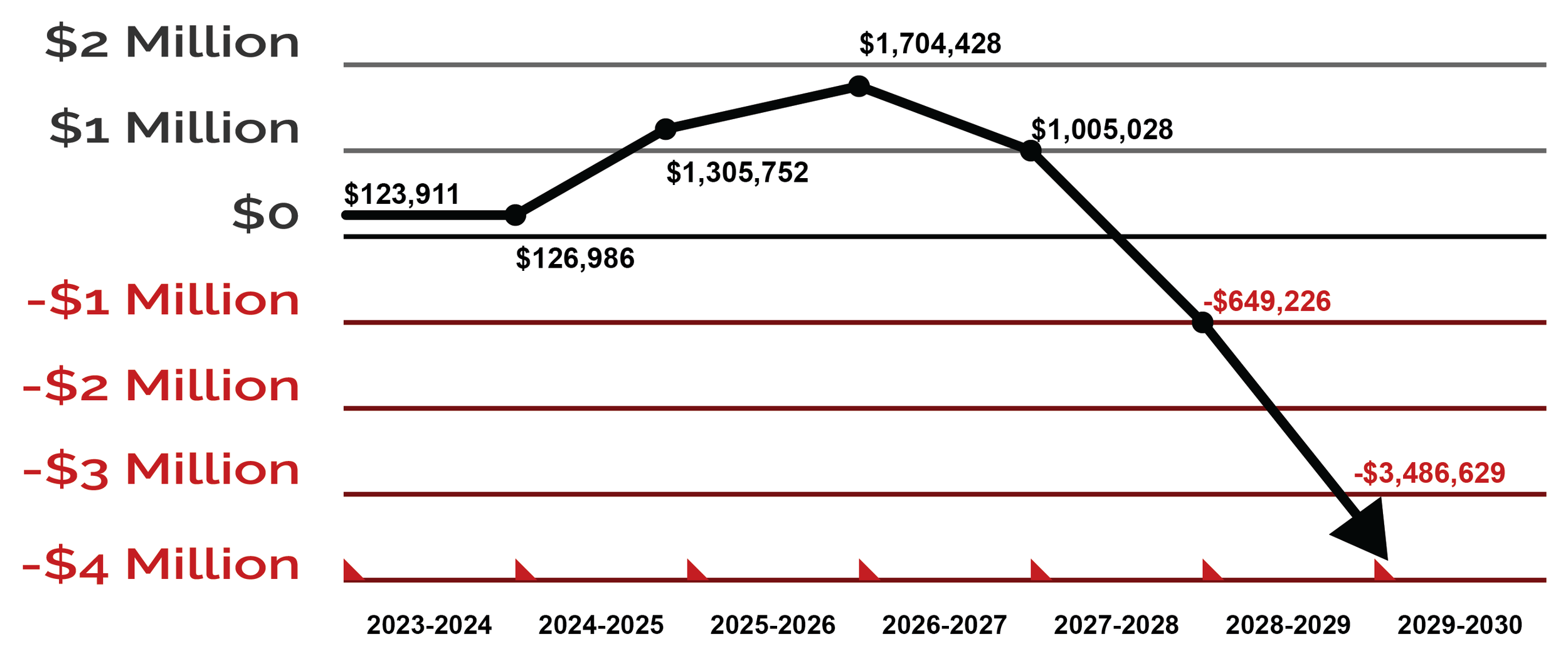 If nothing is done, our budget forecast anticipates the district to be in “Statutory Operating Debt” (SOD), or -2.5% of the annual expense budget, in a few short years. Once in SOD, a school district loses some autonomy to the state of Minnesota.