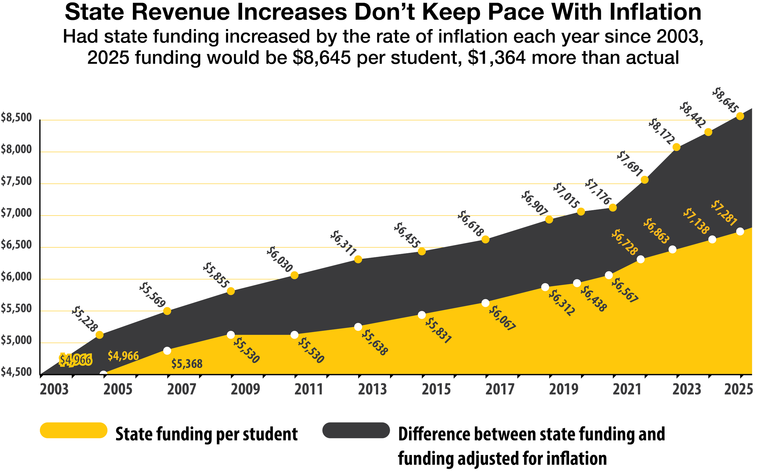 State revenue increases haven't kept pace with inflation – had state funding increased by the rate of inflation each year since 2003, 2025 funding would be $8,543 per student, $1,262 more than actual – with 2,324 students, that’s the equivalent of nearly $3 million annually
